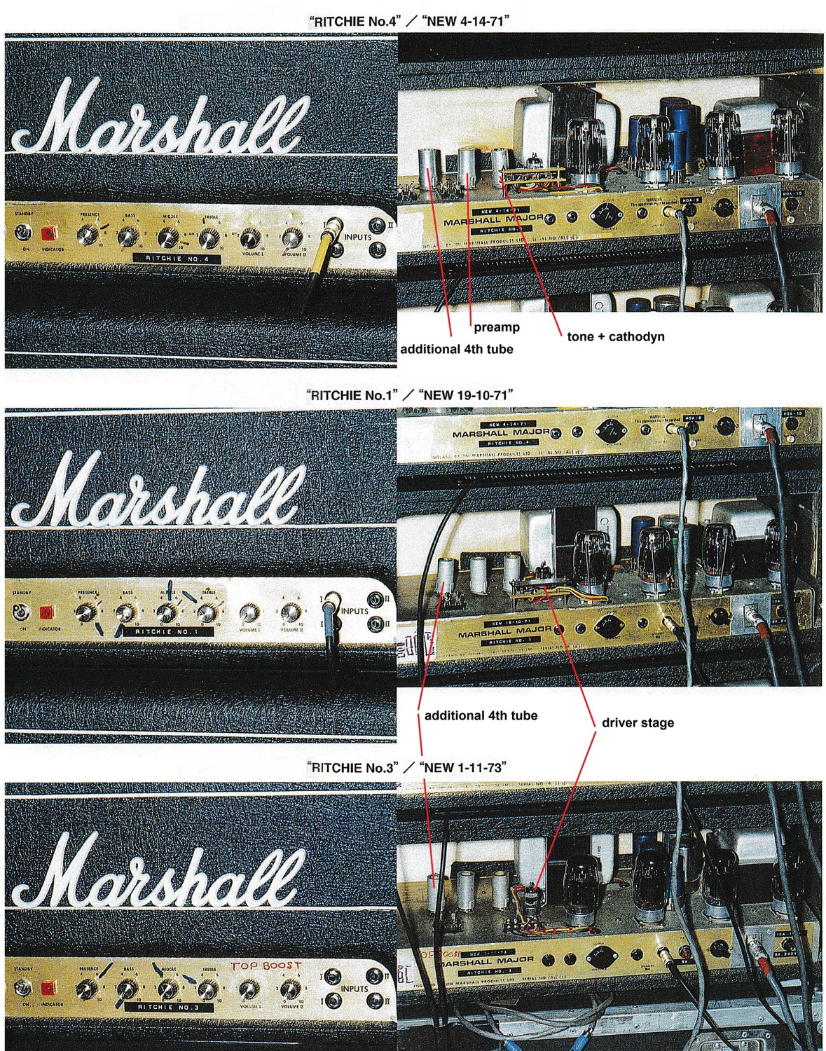 A short remark about the gain factor at the Marshall Major series. Compared with the usual Marshall 100watt series, the Major´s gain was lower, about -6dB lower, therefore it was not possible to overdrive the Major amp with a Strat straight into the amp. Therefore, Ritchie solved this problem … He used a Hornby-Skewes Treble Booster in front of his amp to compensate for the lack of gain and mainly to overdrive the preamp. There is something special to keep in mind: the "Bright" volume control in the "Bright" channel of the Major's preamp not only changed the volume, but, as became common in the so-called Marshall "Plexi" era from 1966 on, also the bass response. The higher the volume was set at the "Bright" volume control and especially from position greater #7, the more bass was additionally reduced. With a high "Bright" volume, the following triode-stage could still be driven hard with a lot of punch. With this high setting, Ritchie liked the sound very much but unfortunately at this setting the Major was very loud. When the "Bright" volume was reduced, however, this dominant crunch effect disappeared. Again, Ritchie quickly found a solution for this issue: the Hornby-Skewes treble booster was simply equipped with an additional volume control at the output of the circuit. This way the Major´s preamp "Bright" volume could remain set quite high while the new volume control of the treble booster controlled the volume to a certain degree. When turning down the "Bright" volume of the Major, the amp quickly lost its tonal magic because of its special circuit design. Later on Ritchie will have his Majors modified. …. To get his amp modified Ritchie went to the Marshall company because he knew Jim Marshall well from his early successless mid 60´s time in the music scene where he spent a lot of time hanging around in Jim Marshall´s music shop. To quote Jim Marshall: "Ritchie more or less lived in my shop". The most important modification in this context was cascading both pre-amp triodes, connecting the unused triode from the Majors “Normal” channel with the stock one, as pre-amp stage with a relatively low gain factor (approx. factor 10 = 20dB instead of the common 35dB of a standard pre-amp tube). Furthermore, an additional 4th tube was installed in each of Ritchie's Majors, about whose actual function only a few people really know anything today, so there is a lot of speculation about it. The following mods over the next years resulted in a VOX-style tone of his amps, giving him his signature Blackmore sound: modified Major amps + HS-Booster + Stratocaster.